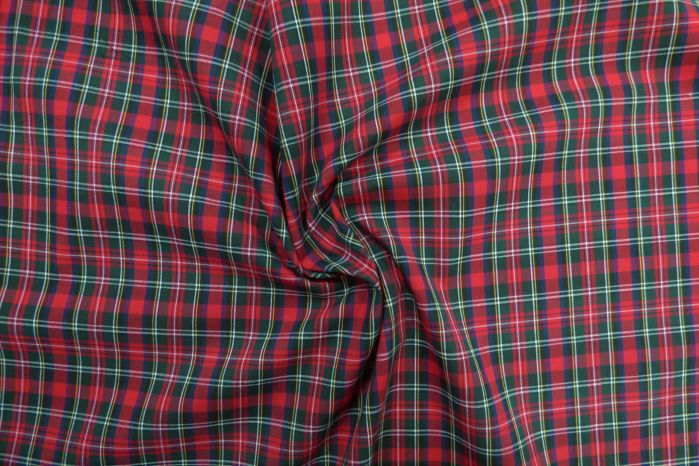 A Lovely Typical Replica Scottish Tartan Check Lightweight Shirting In Tones Of Red, Forest Green, French Navy & Yellow