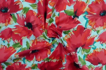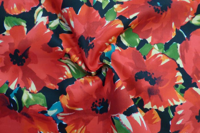 A Stunning Soft Stretch Sateen Drill Digital Print In Tones of Red & Green on Black