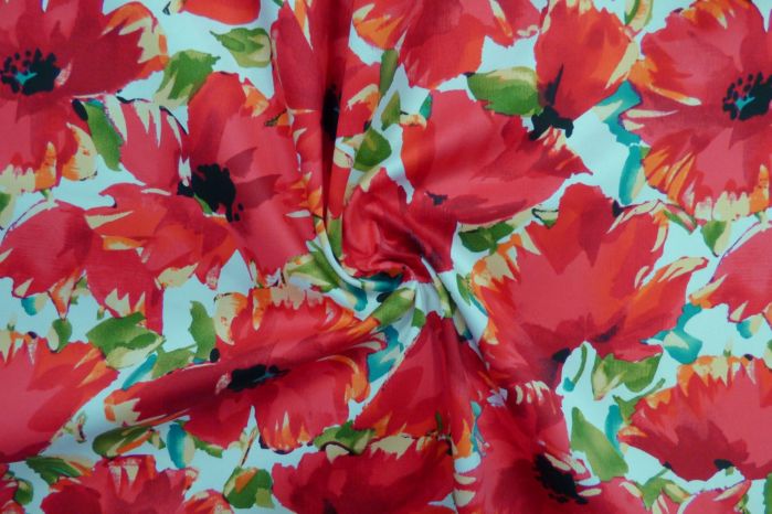 A Stunning Soft Stretch Sateen Drill Digital Print In Tones of Red & Green on White