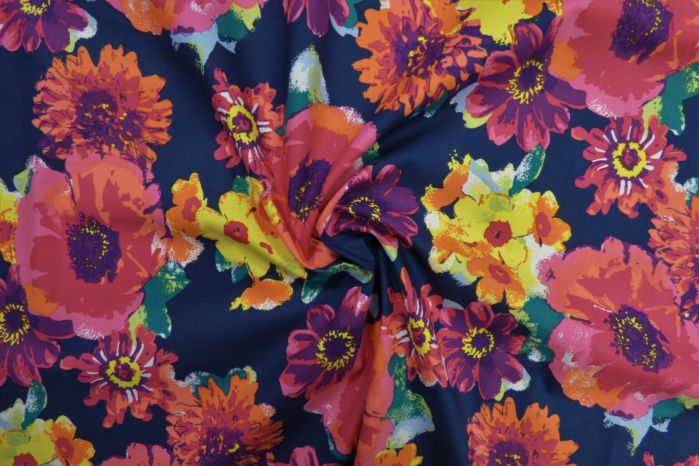 A Lovely Pure Cotton Soft Handle Lawn Digital Print in Tones of Navy, Pink, Orange & Yellow