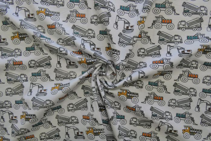 A Lovely Luxury Stretch Jersey Vehicles Print In Tones Of White, Yellow, Orange, Black And Peacock