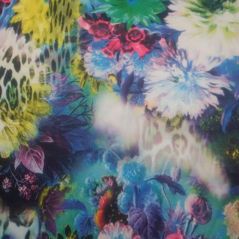 WOW!! A Beautiful Stretch Scuba Jersey With a Vibrant Digital Print in Blue/Mauve/Cerise Shades